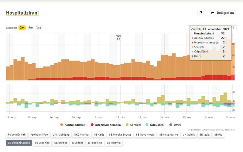 Po podatkih Sledilnika za Covid-19 v SB Slovenj Gradec zdravijo manj covidnih bolnikov kot dan pred tem. Na navadnem oddelku jih je 27, dan pred te, 31. Na intenzivnem oddelku jih je 5, dan pred tem so bili 4. Na novo so v bolnišnico sprejeli 2 bolnika, v domačo oskrbo so odpustili 3. Umrli sta dve osebi s potrjeno okužbo.