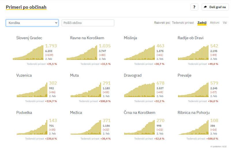 Na Koroškem so včeraj potrdili 631 novih okužb. V Slovenj Gradcu 139, na Ravnah na Koroškem 80, v Mislinji 61, v Radljah ob Dravi 59, v Vuzenici 56, na Muti 55, v Dravogradu 49, na Prevaljah 37, v Podvelki 35, v Mežici in Črni na Koroškem po 22, v Ribnici na Pohorju 16.