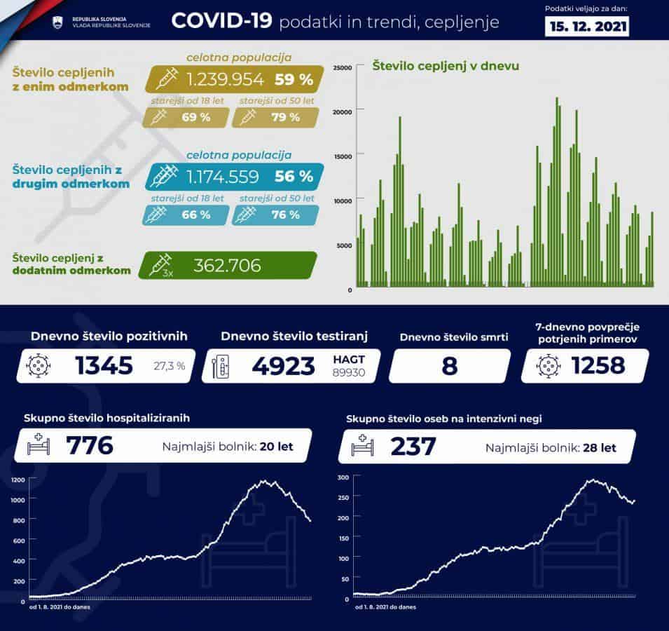V sredo so v Sloveniji ob 4923 PCR-testih potrdili 1345 okužb z novim koronavirusom, dan pred tem so ob 5903 PCR-testih potrdili 1526 okužb. Delež pozitivnih PCR-testov znaša 27,3 odstotka, dan pred tem 25,8 odstotka. Opravili so tudi 89.930 hitrih antigenskih testov, katerih pozitivne rezultate potrjujejo še s PCR-testiranjem, dan pred tem 64.783.
