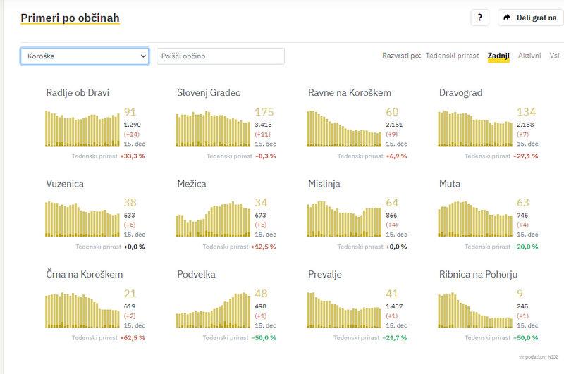 Na Koroškem so včeraj potrdili 65 novih okužb, dan prej 51, pred tednom dni pa 55. Včeraj so jih največ zabeležili v Radljah ob Dravi, in sicer 14, v Slovenj Gradcu 11, na Ravnah na Koroškem 9, v Dravogradu 7, v Vuzenici 6, v Mežici 5, v Mislinji in na Muti po 4, v Črni na Koroškem 2, v Podvelki, na Prevaljah in v Ribnici na Pohorju pa po 1.