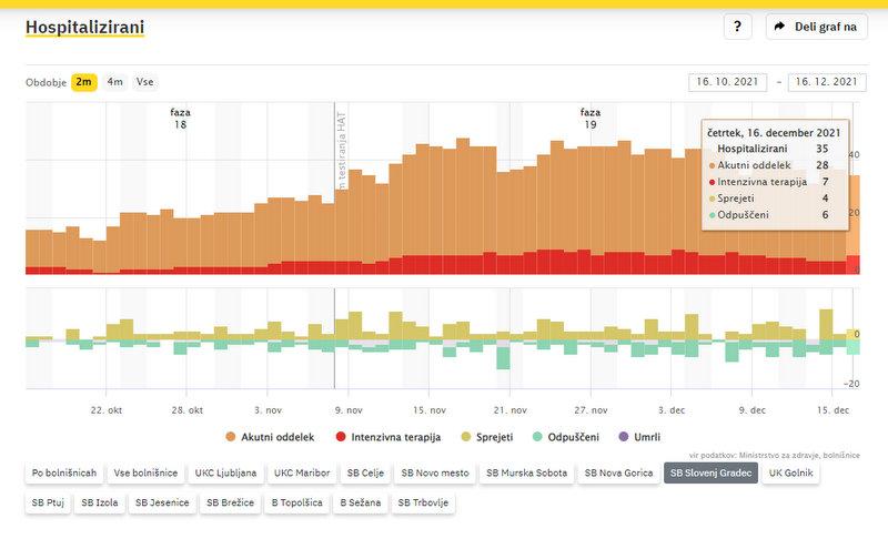 Po podatkih sledilnika v SB Slovenj Gradec zdravijo 35 covidnih bolnikov, od teh jih 7 potrebuje intenzivno zdravljenje. V domačo oskrbo so odpustili 6 oseb, na novo pa so v bolnišnico sprejeli 4 osebe.