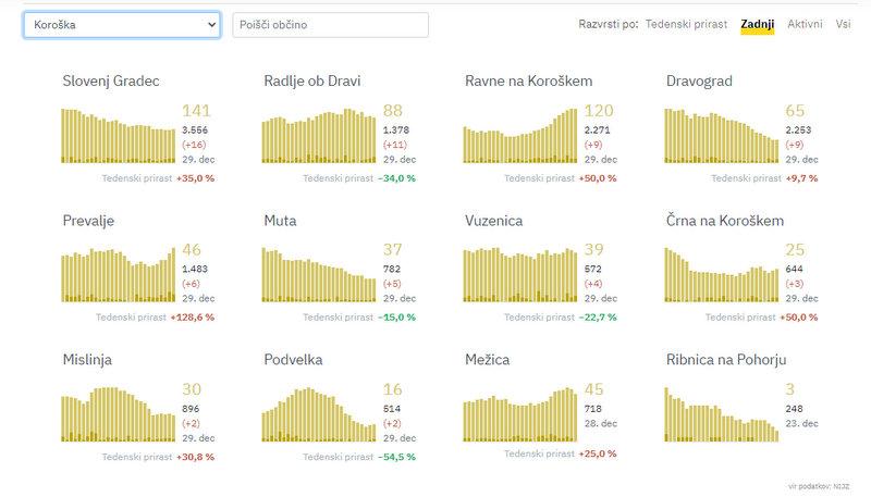 Na Koroškem so včeraj potrdili 67 novih okužb. V Slovenj Gradcu so jih zabeležili 16, v Radljah ob Dravi 11, na Ravnah na Koroškem in Dravogradu po 9, na Prevaljah 6, na Muti 5, v Vuzenici 4, v Črni na Koroškem 3, v Mislinji in Podvelki pa po 2.