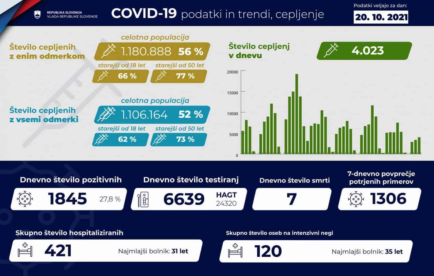 Sedemdnevno povprečje potrjenih primerov se je dvignilo na 1306, kar je 108 več kot dan prej. V zadnjih 14 dneh so potrdili 706 okužb na 100.000 prebivalcev oziroma 42 več kot dan prej. Po oceni NIJZ je v državi trenutno 14.904 aktivnih okužb, po podatkih sledilnika na Koroškem 430.