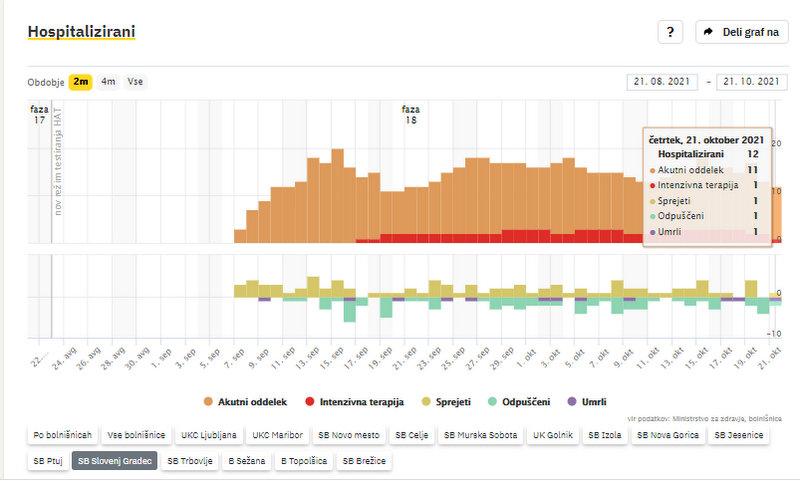V bolnišnicah zdravijo 421 covidnih bolnikov, šest manj kot dan pred tem. 120 na oddelkih intenzivne nege, dva manj kot dan prej. V sredo je umrlo sedem covidnih bolnikov. V Splošni bolnišnici Slovenj Gradec zdravijo 12 bolnikov s potrjeno okužbo, 1 potrebuje intenzivno terapijo. 1 je pa umrl.