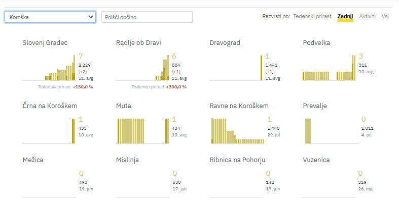 Na Koroškem so včeraj potrdili še 4 nove okužbe, v zadnjih dveh dneh skupno 10. Včeraj so jih zabeležili v treh različnih občinah, in sicer v Dravogradu in Radljah ob Dravi po 1, dve pa v Slovenj Gradcu.