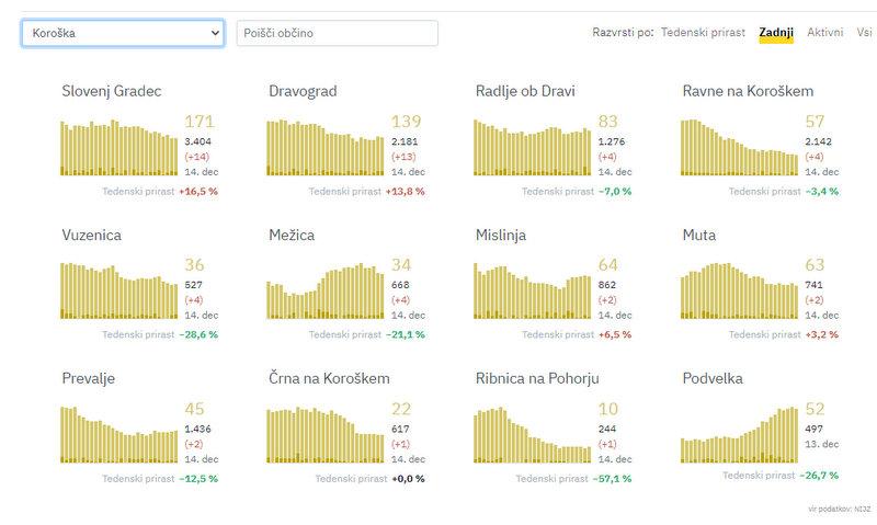 Na Koroškem so včeraj potrdili 51 okužb z novim koronavirusom, dan prej 84, pred tednom dni pa 33. V Slovenj Gradcu 14, v Dravogradu 13, v Radljah ob Dravi, Ravnah na Koroškem, Vuzenici in v Mežici po 4, v Mislinji, na Muti in na Prevaljah po 2, v Črni na Koroškem in Ribnici na Pohorju pa po 1.