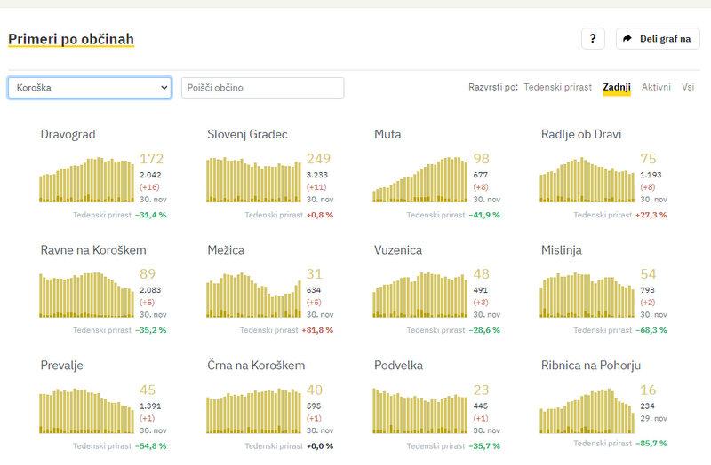 Včeraj so na Koroškem največ novih okužb potrdili v Dravogradu, in sicer 16, v Slovenj Gradcu 11, na Muti in v Radljah ob Dravi po 8, na Ravnah na Koroškem in v Mežici po 5, v Vuzenici 3, v Mislinji 2, na Prevaljah, v Črni na Koroškem in Podvelki pa po 1.