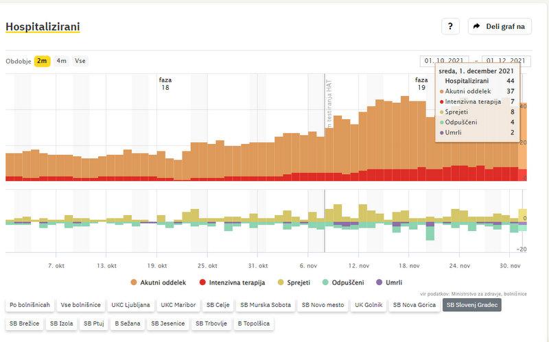 V SB Slovenj Gradec zdravijo 44 covidnih bolnikov, dan prej 42. Intenzivno terapijo jih potrebuje 7. V bolnišnico so na novo sprejeli 8 oseb, v domačo oskrbo so odpustili 4 oseb, umrli sta dve osebi.
