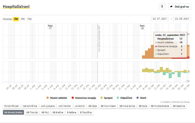 V bolnišnicah po vladnih podatkih zdravijo 384 covidnih bolnikov, 105 na intenzivnih oddelkih. Umrlo je deset bolnikov s potrjeno okužbo, kar je največ v enem dnevu po 27. aprilu. V SB Slovenj Gradec zdravijo 12 covidnih bolnikov, 2 potrebujeta intenzivno terapijo.