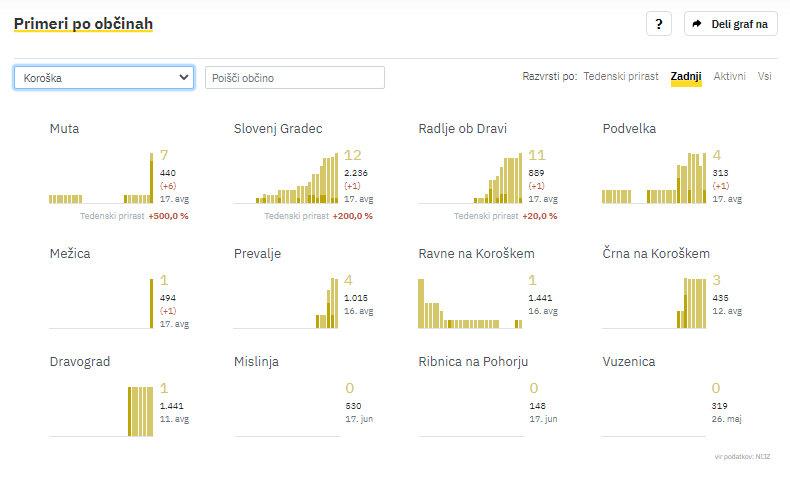 Na Koroškem so včeraj zabeležili deset novih okužb, in sicer po eno v Slovenj Gradcu, v Mežici, Radljah ob Dravi in Podvelki ter 6 na Muti. V zadnjih sedmih dneh so v regiji potrdili 32 okužb, tako povprečje potrjenih primerov znaša 4,6.