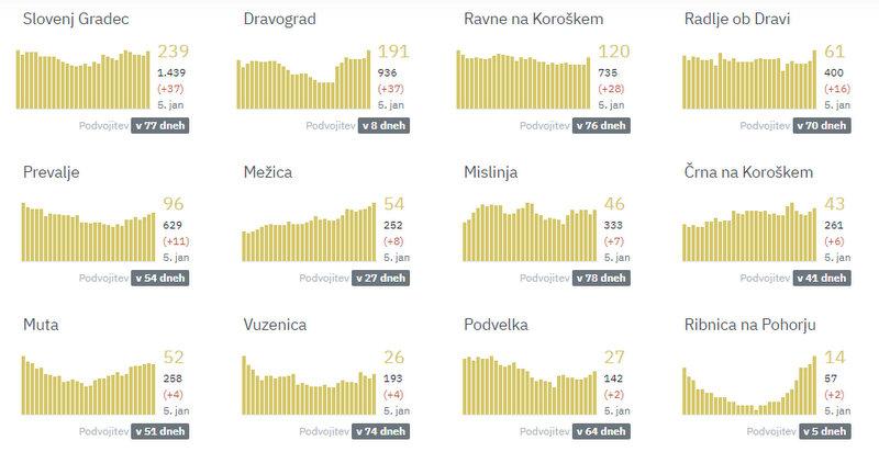 Na Koroškem so največ novih okužb potrdili v Slovenj Gradcu in Dravogradu, kjer so jih zabeležili po 37. Na Ravnah na Koroškem 28, v Radljah ob Dravi 16, na Prevaljah 11, v Mežici 8, v Mislinji 7, v Črni na Koroškem 6, na Muti in v Vuzenici po 4, v Podvelki in Ribnici na Pohorju po 2.