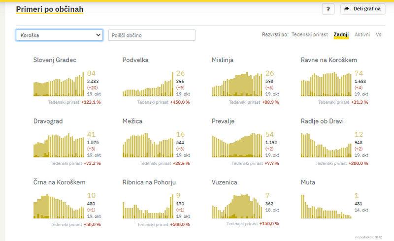 Na Koroškem so potrdili 51 novih okužb, največ v Slovenj Gradcu, in sicer 20. V Podvelki 9, v Mislinji 6, na Ravnah na Koroškem 4, v Dravogradu in Mežici po 3, na Prevaljah in v Radljah ob Dravi po 2, po 1 pa v Črni na Koroškem in Ribnici na Pohorju.