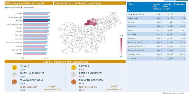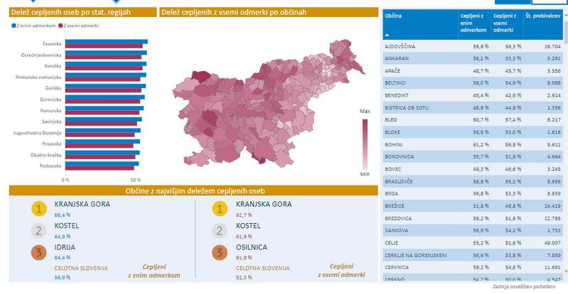Poleg tega pri poročanju o deležu precepljenosti po posameznih občinah po novem upoštevajo tudi začasno prebivališče, ne več samo stalnega. Na prvo mesto med občinami z najvišjim deležem cepljenih oseb se je tako povzpela Kranjska Gora, kjer je z enim odmerkom cepljenih 66,4 odstotka prebivalcev, z vsemi pa 62,7 odstotka.