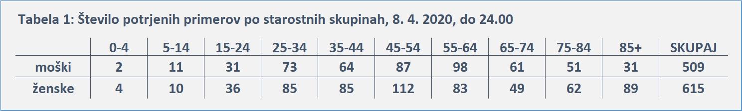 Kot poroča NIJZ je bilo do 8.4.2020 do 24. ure je bilo opravljenih 31.813 testiranj, od tega je bilo 1136 pozitivnih testov.