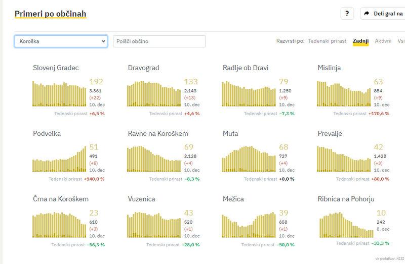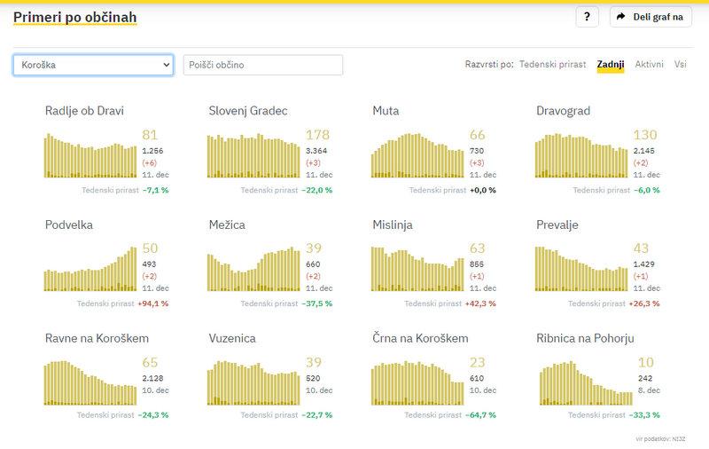 V petek so na Koroškem potrdili 74 novih okužb. V Slovenj Gradcu so jih zabeležili 22, v Dravogradu 13, v Radljah ob Dravi in v Mislinji 9, v Podvelki 5, na Ravnah na Koroškem in na Muti po 4, na Prevaljah in v Črni na Koroškem po 3, v Vuzenici in Mežici pa po 1.