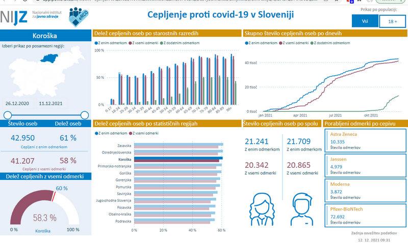 Z enim odmerkom cepiva proti covidu-19 je po podatkih NIJZ cepljenih 1.238.292 ljudi ali 59 odstotkov celotne populacije. Med starejšimi od 18 let je z enim odmerkom cepljenih 69 odstotkov, med starejšimi od 50 let pa 79 odstotkov.