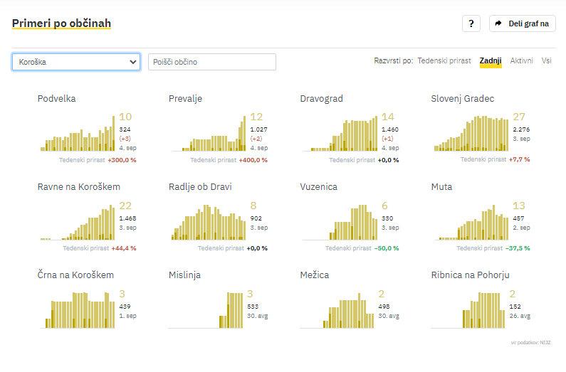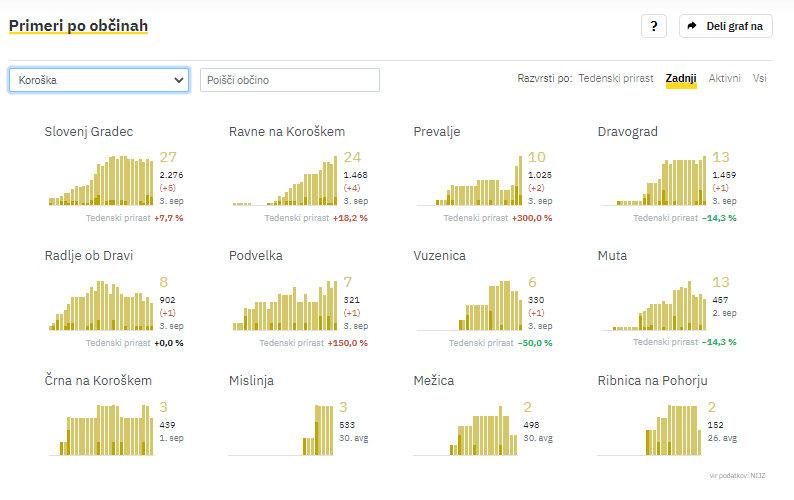 V petek so na Koroškem potrdili 15 novih okužb, največ v Slovenj Gradcu, kjer so jih zabeležili 5, na Ravnah na Koroškem 4, na Prevaljah 2, v Dravogradu, Radljah ob Dravi, Podvelki in v Vuzenici pa po 1.