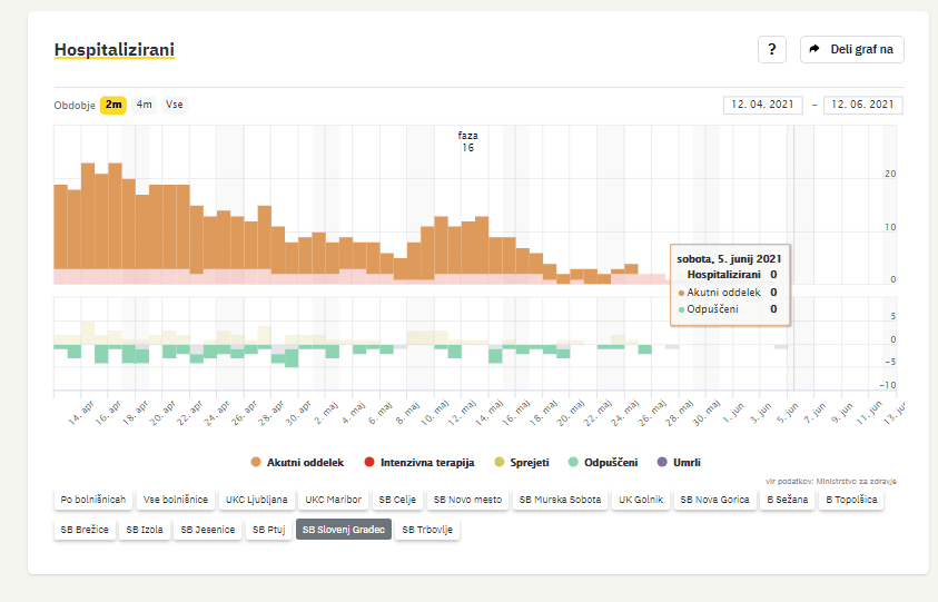 Po zadnjih podatkih Covid-19 sledilnika v Splošni bolnišnici Slovenj Gradec ne zdravijo nobenega covidnega pacienta. Nazadnje so imeli hospitaliziranega bolnika s potrjeno okužbo pred tednom dni, v soboto, 5. junija 2021.