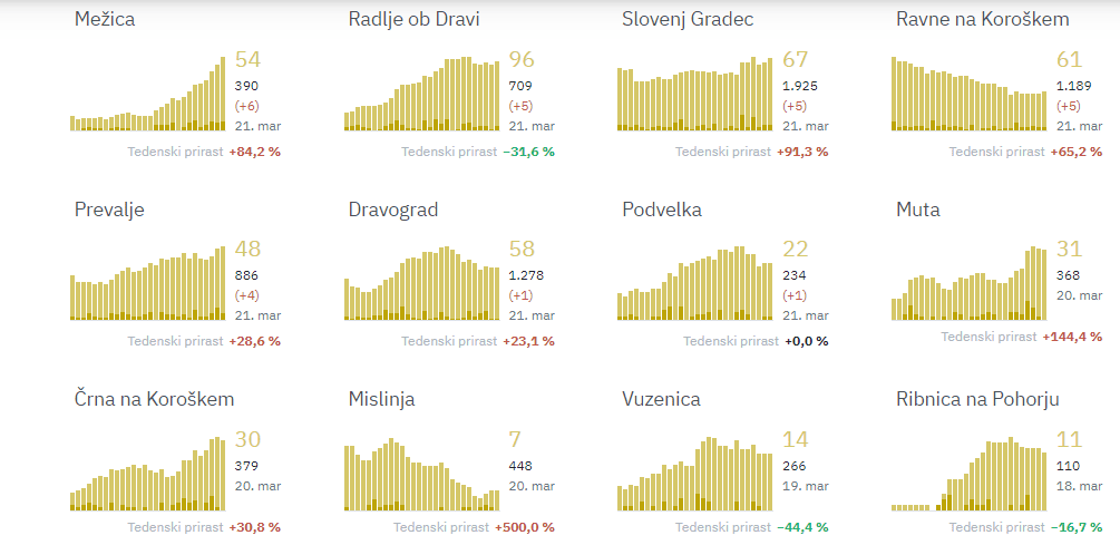 Mežica 6, Radlje ob Dravi 5, Slovenj Gradec 5, Ravne na Koroškem 5, Prevalje 4, Dravograd 1, Podvelka 1.