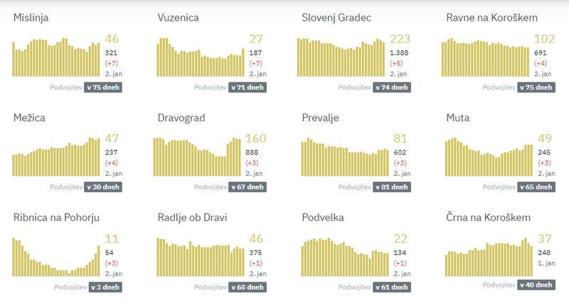 Na Koroškem so največ novih okužb odkrili v Mislinji in Vuzenici, kjer so jih zabeležili po 7. V Slovenj Gradcu 5, na Ravnah na Koroškem in v Mežici po 4, v Dravogradu, Ribnici na Pohorju, na Muti in Prevaljah po 3, v Radljah ob Dravi in Podvelki po 1.