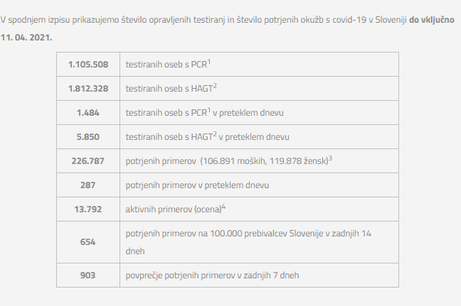 Število opravljenih testiranj in število potrjenih okužb s covid-19 v Sloveniji do vključno 11. 04. 2021.
