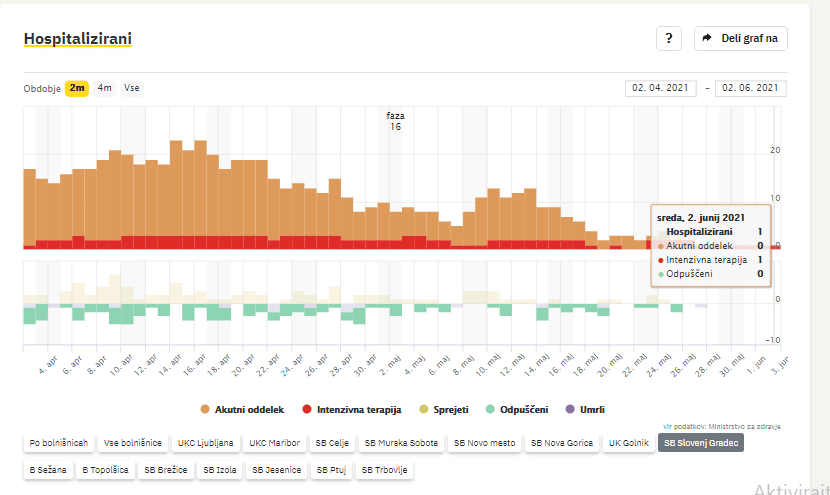 V Splošni bolnici Slovenj Gradec se po zadnjih podatkih Covid-19 sledilnika zdravi en covidni pacient in sicer na oddelku intenzivne terapije. Iz bolnišnice niso odpustili nobenega pacienta. Umrl ni nihče.
