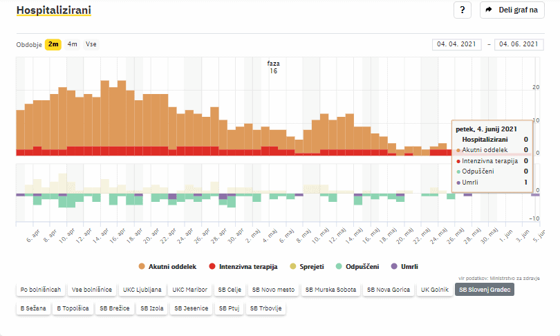 V Splošni bolnici Slovenj Gradec se po zadnjih podatkih Covid-19 sledilnika ne zdravi nobeden covidni pacient. Umrla je ena oseba s potrjeno okužbo.