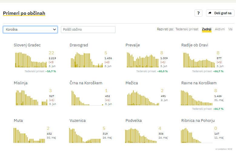 Včeraj so največ novih okužb potrdili v Slovenj Gradcu, in sicer 3, v Dravogradu 2, na Prevaljah, v Radljah ob Dravi, Mislinji in Črni na Koroškem pa po 1 novo okužbo.