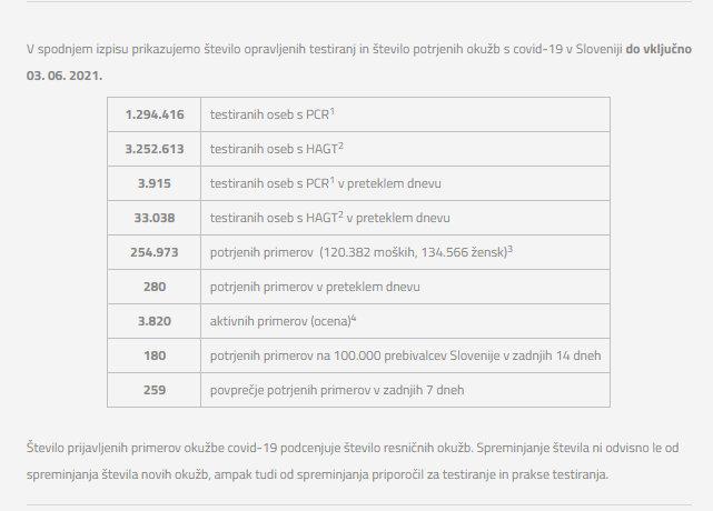 Število opravljenih testiranj in število potrjenih okužb s covidom-19 do vključno 3. 6. 2021