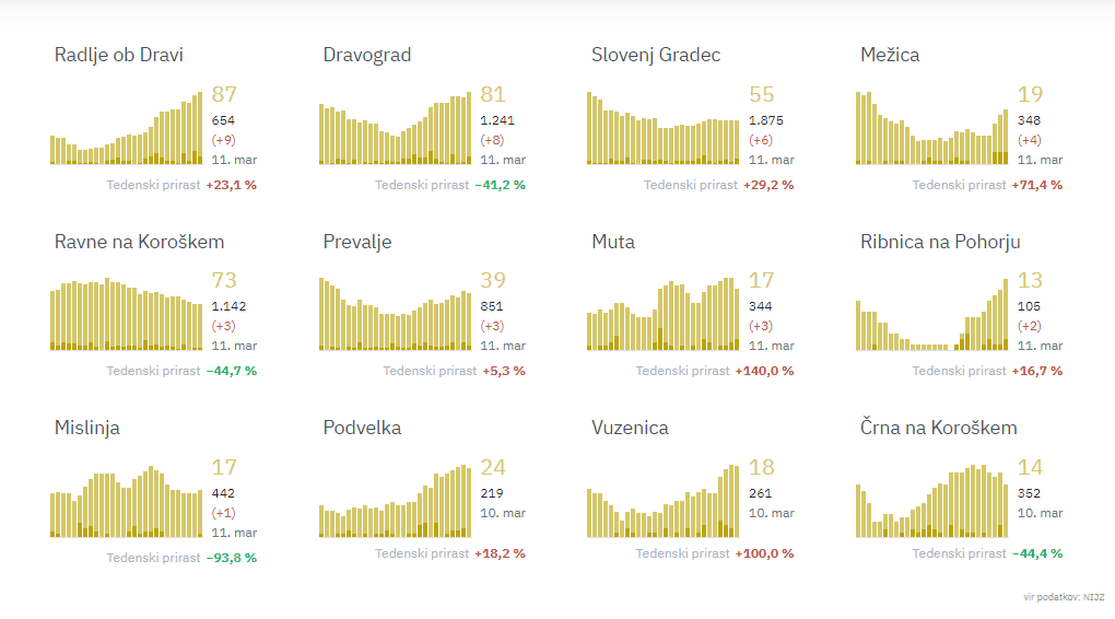 Radlje ob Dravi 9, Dravograd 8, Slovenj Gradec 6, Mežica 4, Ravne na Koroškem 3, Prevalje 3, Muta 3, Ribnica na Pohorju 2, Mislinja 1.
