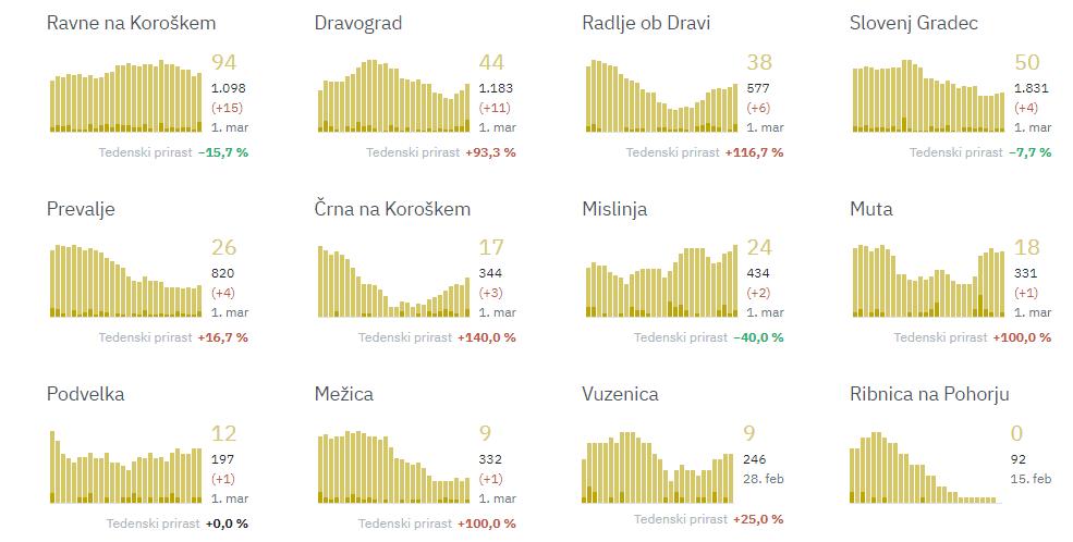 Ravne na Koroškem 15, Dravograd 11, Radlje ob Dravi 6, Slovenj Gradec 4, Prevalje 4, Črna na Koroškem 3, Mislinja 2, Muta 1, Podvelka 1, Mežica 1.