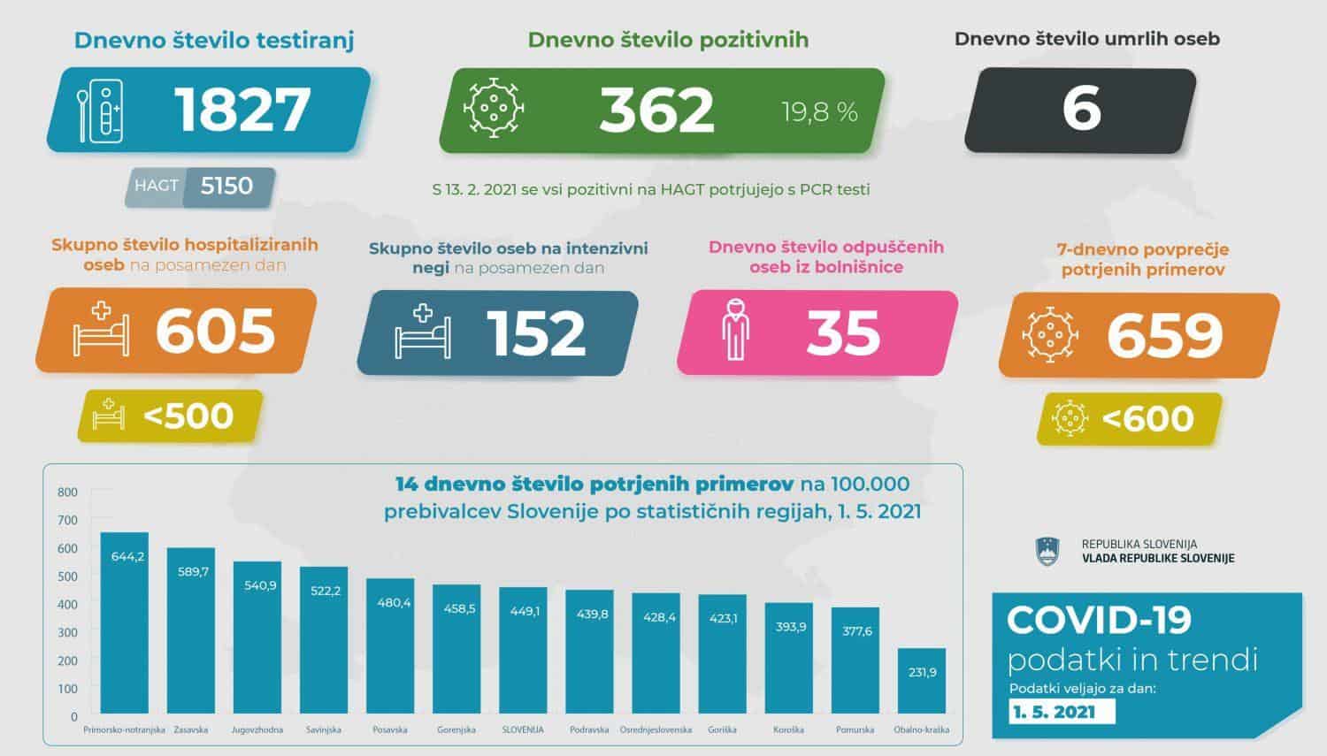 Delež potrjenih testov na ravni države je bil 19,8-odstoten. V bolnišnicah se zdravi 605 oseb s covidom-19, od tega na intenzivni negi 152. Umrlo je šest covidnih bolnikov.