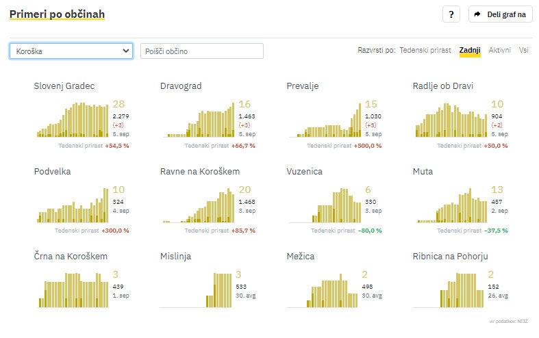 Včeraj so nove okužbe potrdili v Slovenj Gradcu, kjer so zabeležili tri. Prav tako so po tri potrdili še na Prevaljah in v Dravogradu, 2 pa v Radljah ob Dravi.