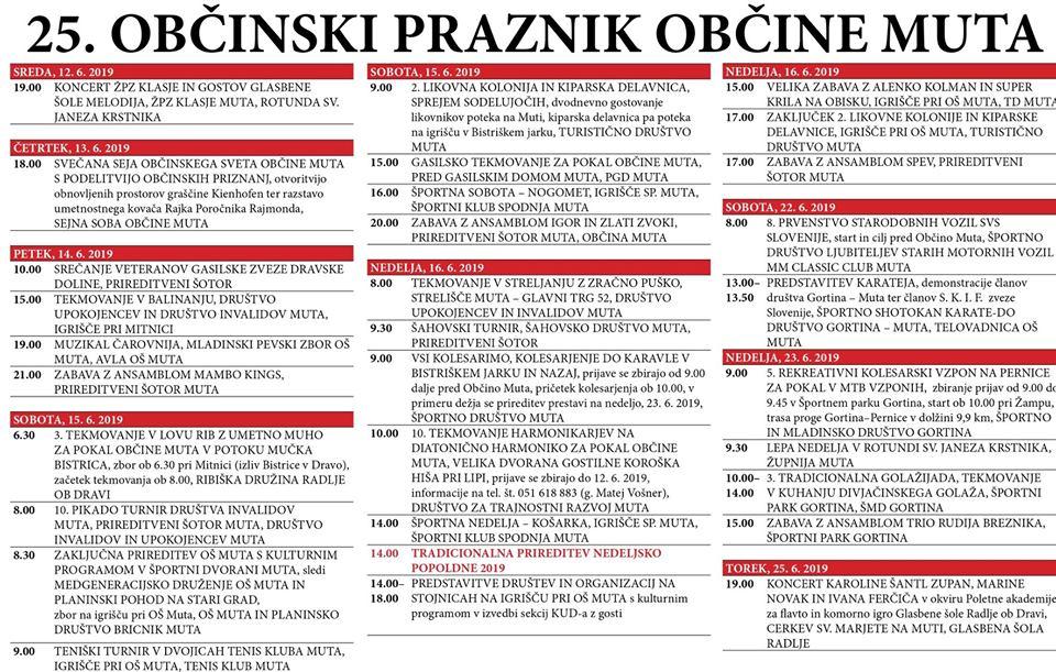 Občina Muta v mesecu juniju praznuje svoj 25. občinski praznik, ki so ga otvorili z včerajšnjo slavnostno sejo Občinskega sveta Muta. Praznovanje bo sicer trajalo vse tja do 25. junija, ko se bo na Muti zvrstilo približno 40 prireditev in dogodkov.