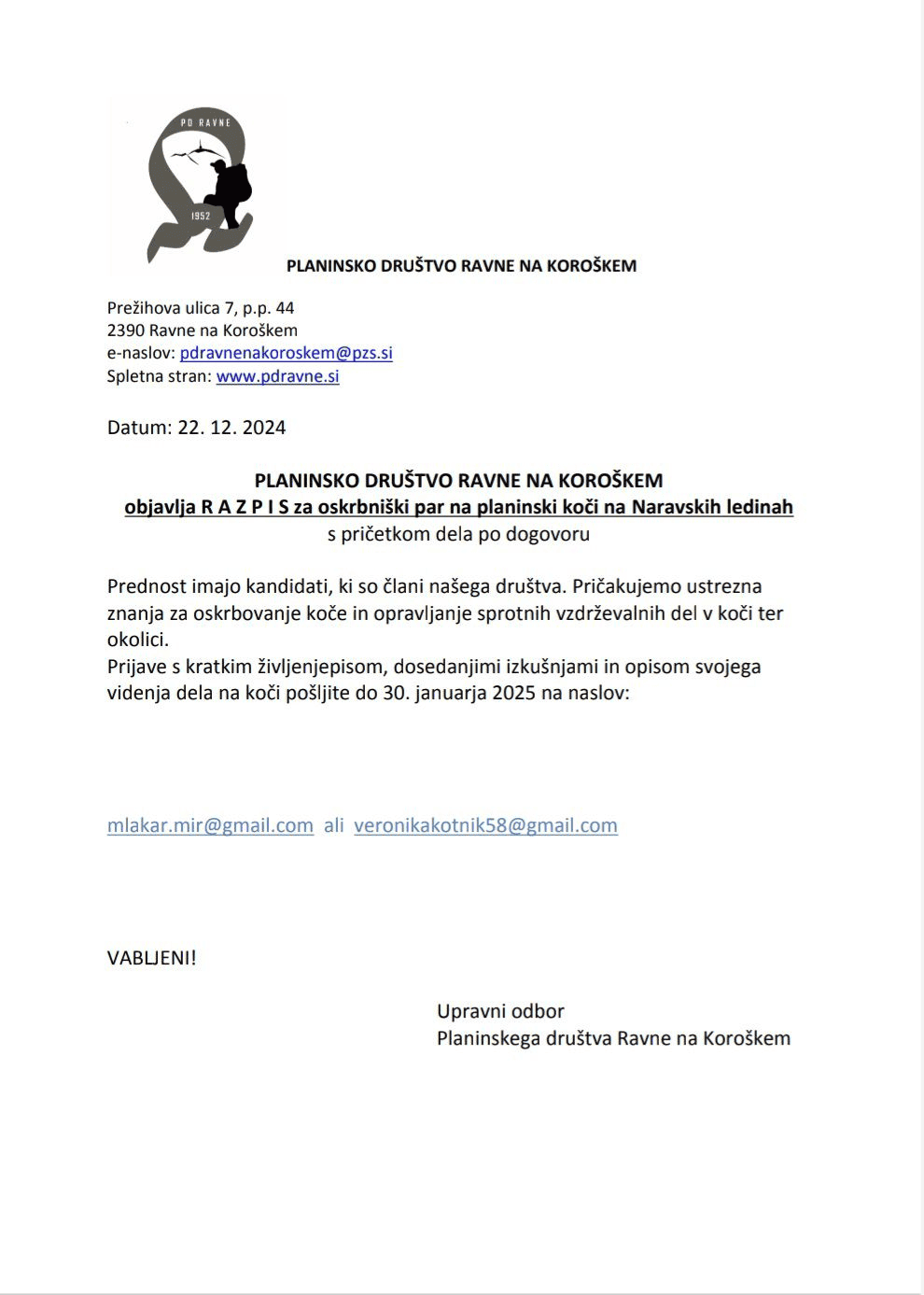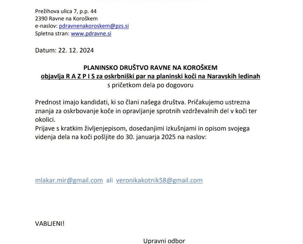 Prijave s kratkim življenjepisom, dosedanjimi izkušnjami in opisom svojega videnja dela na koči, pošljite do 30. januarja 2025 na email naslov, mlakar.mir@gmail.com ali veronikakotnik58@gmail.com.