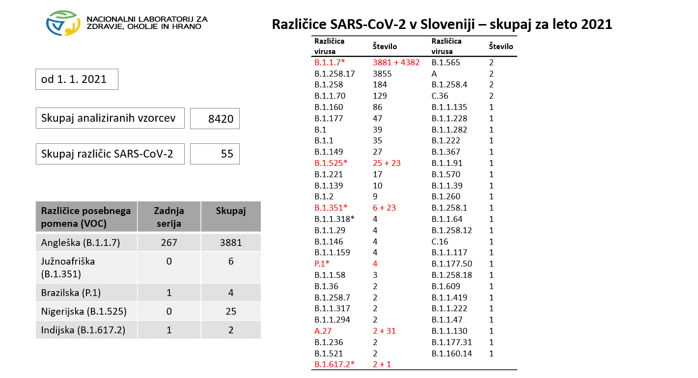 Angleška različica novega koronavirusa je prevladala, saj je Nacionalni laboratorij za zdravje, okolje in hrano (NLZOH) ugotovil, da je med pozitivnimi PCR testi v zadnjem tednu njen delež dosegel 100 odstotkov. Tudi pri bolnikih, ki se zdravijo na intenzivnih oddelkih, so to različico potrdili v 100 odstotkih primerov.