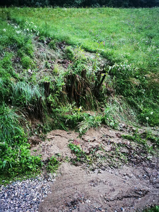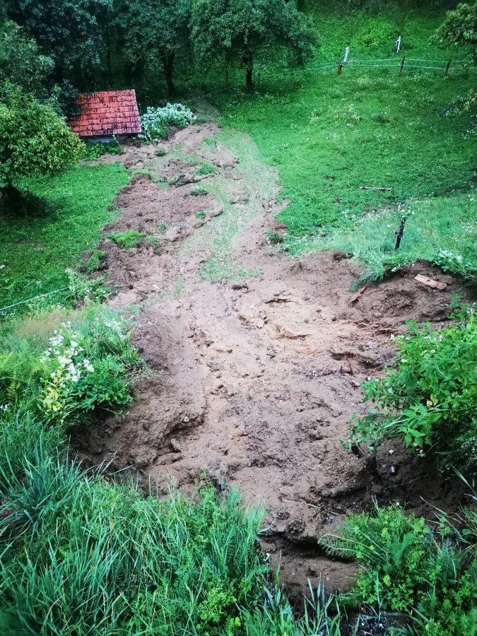 V Otiškem Vrhu v občini Dravograd pa je na območju Kmetije Golob včerajšnji naliv povzročil tudi zamašitev cestnega cevnega propusta in velike količine meteorne vode so posledično sprožile zemeljski plaz, ki je ogrozil zajetje in zbiralnik ter črpališče pitne vode za omenjeno kmetijo.