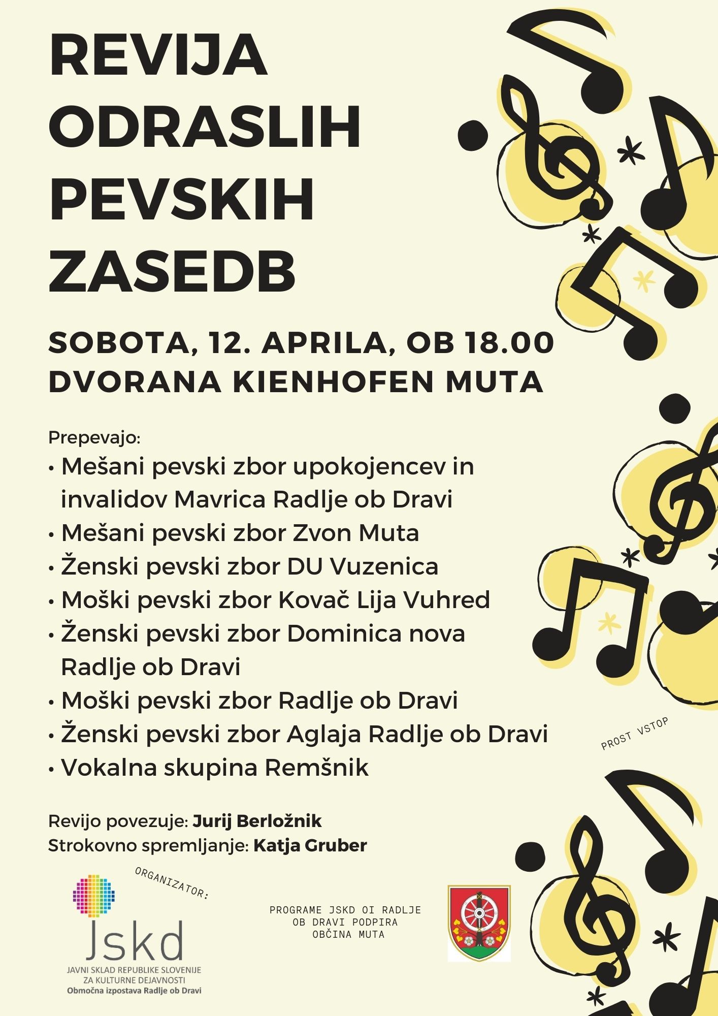 Dragi ljubitelji zborovske glasbe, To soboto se pridružite poslušalcevm in gledalcem Območne revije odraslih pevskih zborov in doživite večer ubranega petja, čudovitih melodij in druženja.