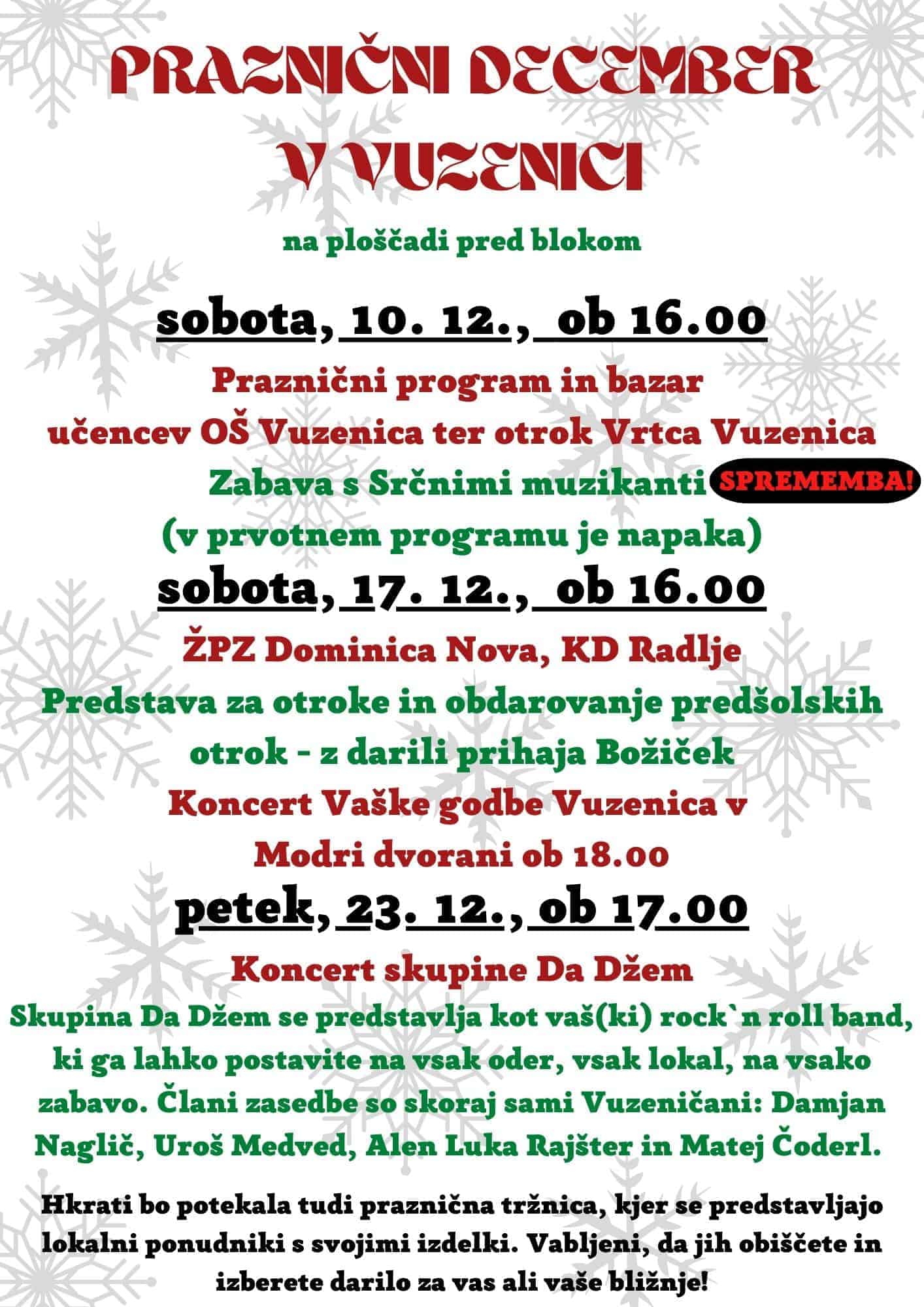 Veselo decembrsko druženje se končuje ta petek, 23. decembra, ob 17. uri, ko vas čaka koncert skupine DaDžem. Skupina DaDžem se predstavlja kot vaš(ki) rock ‘n roll band, ki ga lahko postavite na vsak oder, v vsak lokal, na vsako zabavo. Člani zasedbe so skoraj sami Vuzeničani: Damjan Naglič, Uroš Medved, Alen Luka Rajšter in Matej Čoderl.