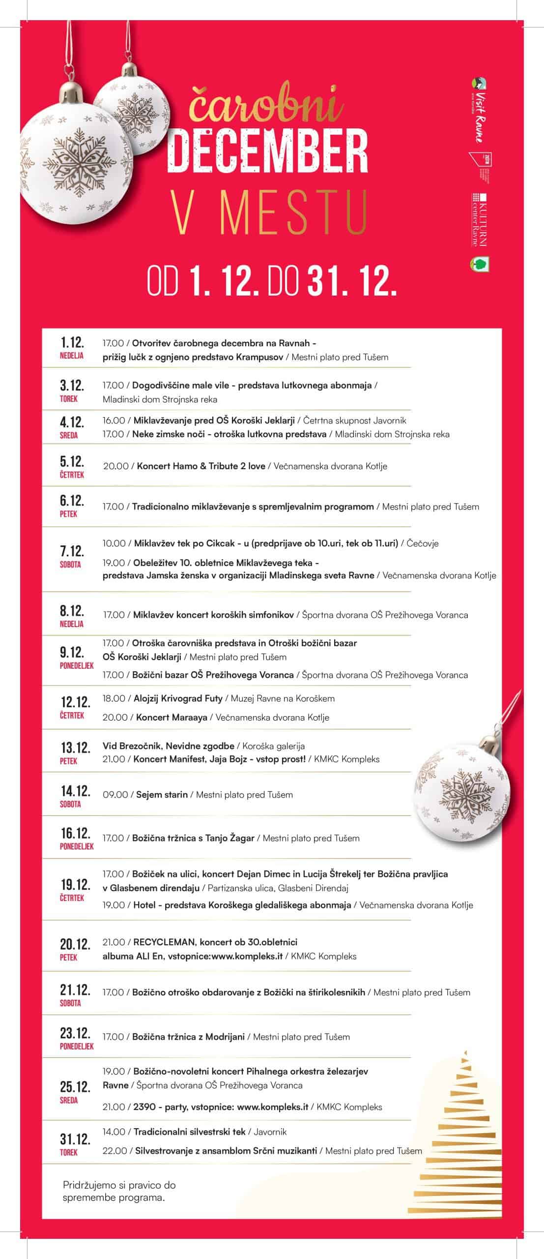 Poleg navedenega Čarobni december prinaša vrsto koncertov izjemnih imen glasbenega sveta: v goste prihajajo Hamo & Tribute 2 love, Maraaya, Tanja Žagar, Manifest, Jaja Bojz, Recycleman, Modrijani ter gledaliških predstav: Dogodivščine male vile, Neke zimske noči, otroška čarovniška predstava, ki bodo popestrili praznično vzdušje tudi po ožjih delih lokalne skupnosti, na različnih lokacijah, od Mladinskega doma Strojnska Reka, Večnamenske dvorane Kotlje, KMKC Kompleks, do prizorišča na mestnem platoju in dvorane pri OŠ Prežihovega Voranca.