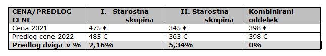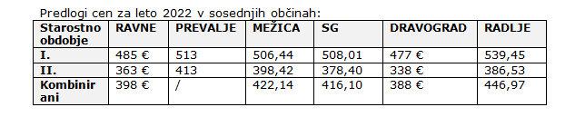 V gradivu so objavili tudi tabelo - Predlogi cen za leto 2022 v sosednjih občinah.
