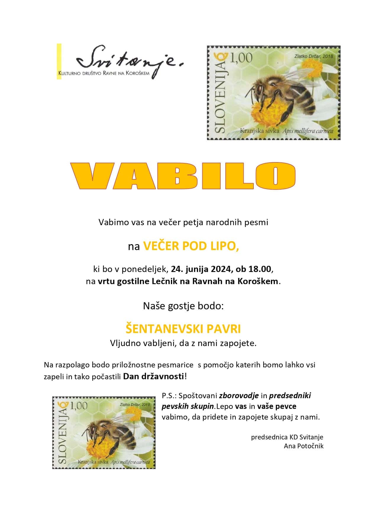 Večer pod lipo bo večer petja narodnih pesmi. Ta bo potekal v ponedeljek, 24. junija 2024, ob 18. uri, na vrtu gostilne Lečnik na Ravnah na Koroškem.