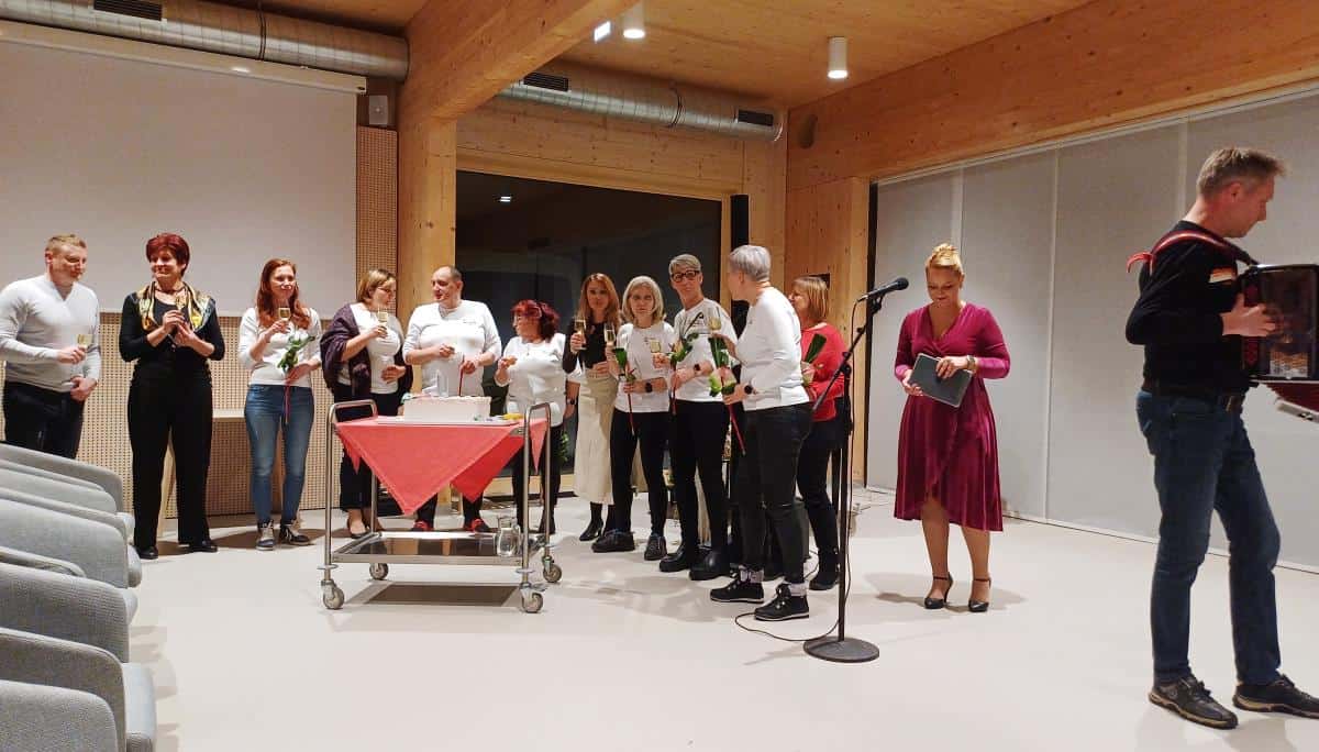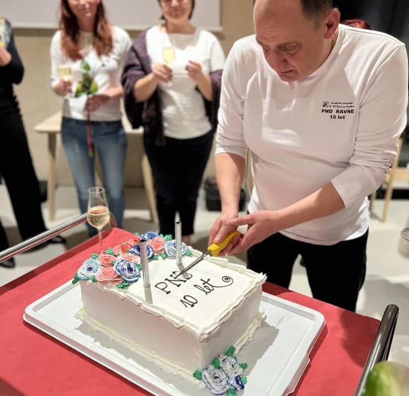 Ob zaključku slavnostnega dogodka je sledil svečan prerez torte in povabilo na pogostitev ter trenutek, da so nazdravili in izrekli čestitko ob jubileju.