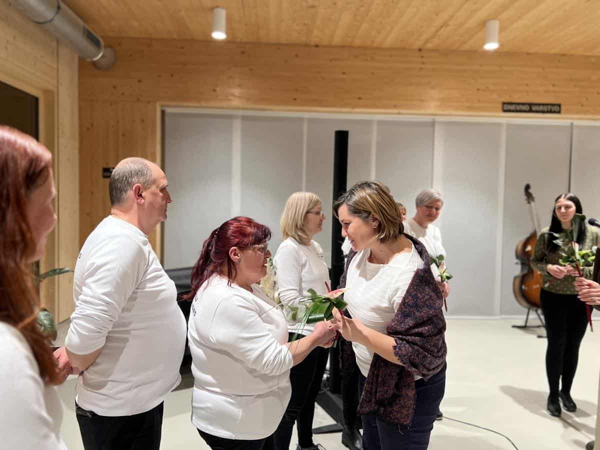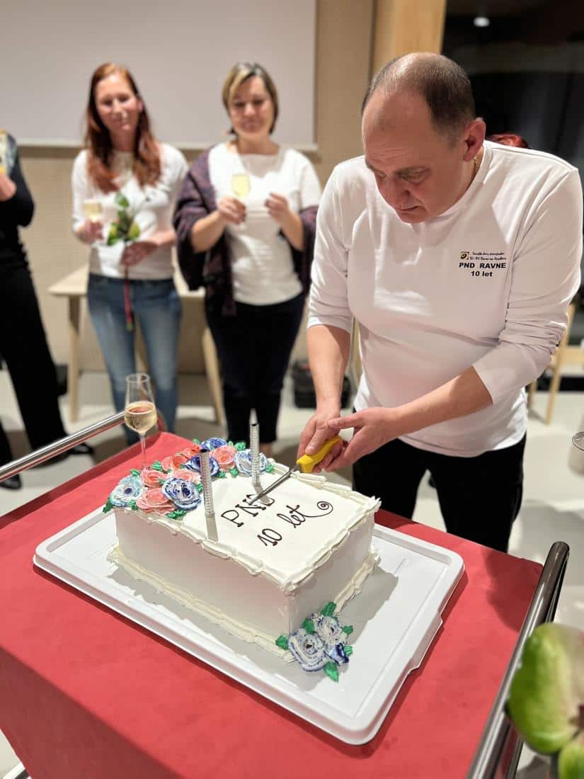 Ob zaključku slavnostnega dogodka je sledil svečan prerez torte in povabilo na pogostitev ter trenutek, da so nazdravili in izrekli čestitko ob jubileju.