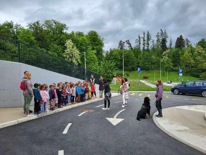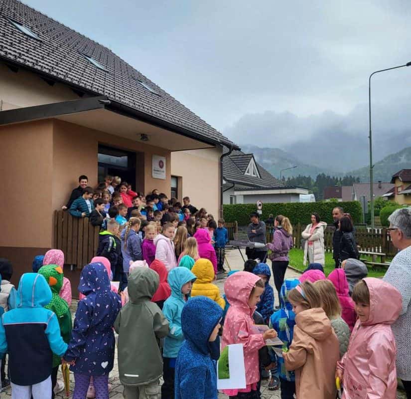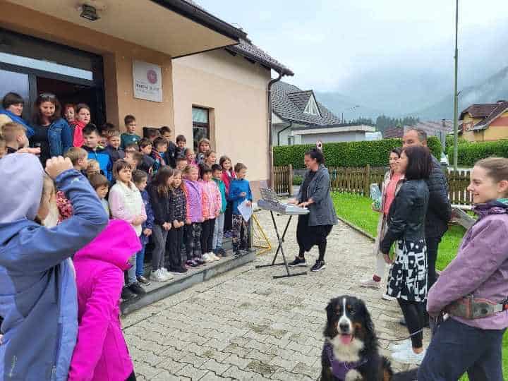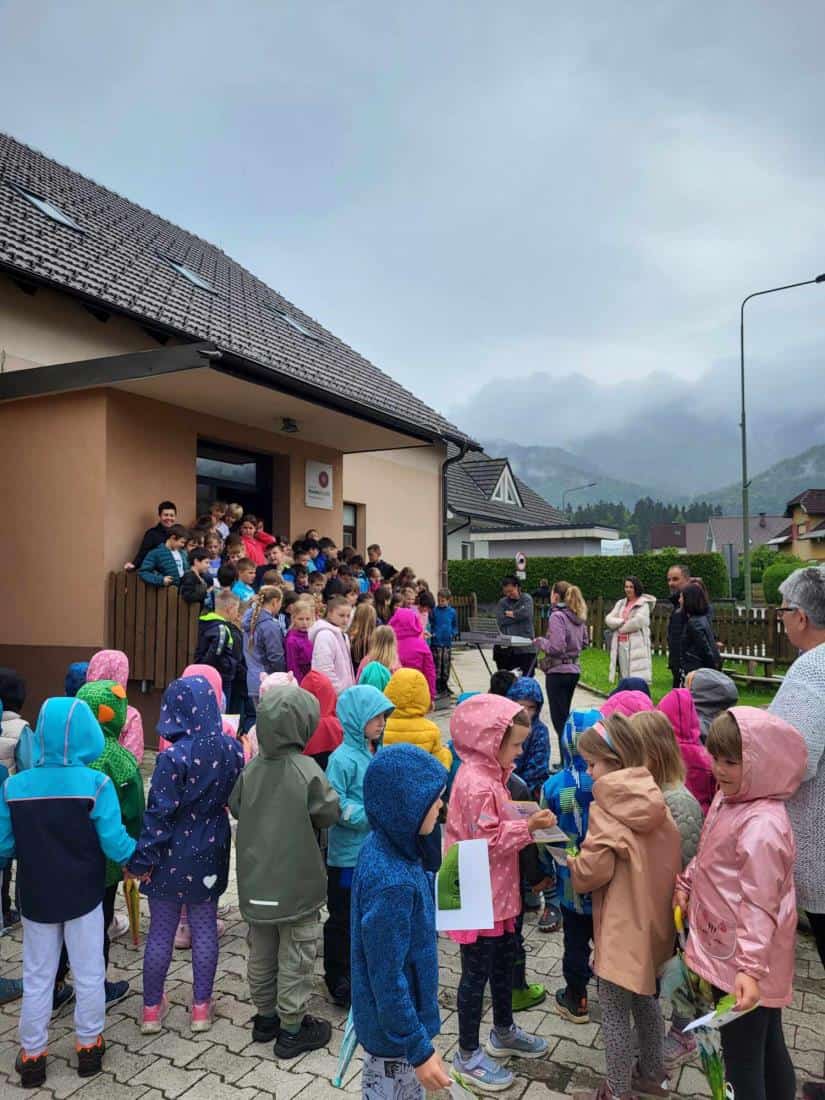Ker je vreme malo nagajalo, so se hitro odpravili še v Kotlje, kjer so se nam pred OŠ KJ, podružnica Kotlje, pridružili učenke in učenke ter vrtičkarji iz vrtca v Kotljah. Zapeli so nekaj hudomušnih pesmic o kužkih in videli so, da veliko vedo o tem, kako pomembno je, da pobiramo kakce za svojimi kužki.