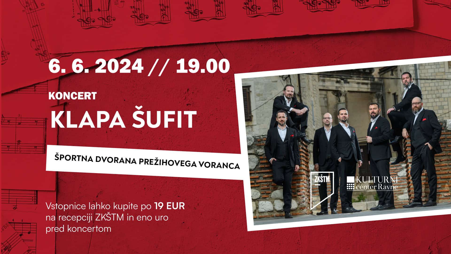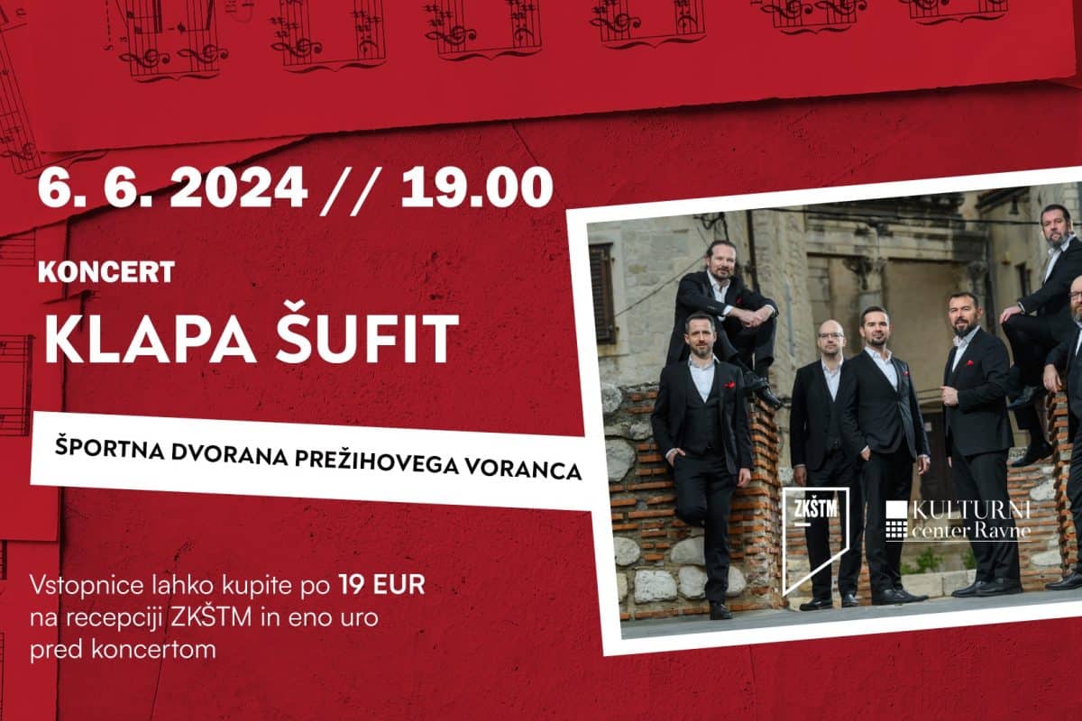 Na Ravnah na Koroškem se obeta čudovit glasbeni dogodek, ki ga organizirata ZKŠTM Ravne in Kulturni center Ravne. V četrtek, 6. junija 2024, bo ob 19. uri v Športni dvorani Prežihovega Voranca nastopila ena najbolj priljubljenih klap – Klapa Šufit.