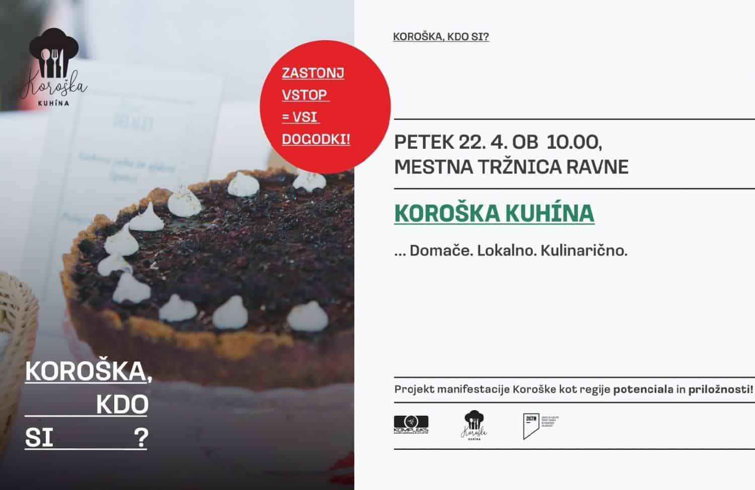 Koroška kuhína bo odprta v petek, 22. 4. 2022, od 10. ure dalje. Kulinarična ponudba bo sestavljena iz glavne jedi, sladice in pijače po enotnih cenah. Prodaja bonov bo na dan dogodka potekala na blagajni na prizorišču.
