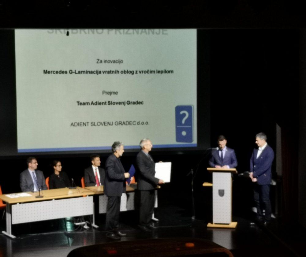 Nagrajenec: ADIENT SLOVENJ GRADEC d.o.o. Naslov inovacije: Mercedes G-Laminacija vratnih oblog z vročim lepilom. Inovatorji: Team Adient SG. S procesno-organizacijsko inovacijo, ki se nanaša na izdelavo vratnih panelov za Mercedes G, je multidisciplinarni team Adient Slovenj Gradec z izboljšavami omogočil selitev proizvodnje linije iz druge lokacije v tujini v Slovenj Gradec. Z uvedbo popolnoma nove tehnologije so dokazali sposobnost proizvodnje za najzahtevnejše kupce. Multidisciplinarno ekipo sestavljajo projektni inženirji, planerji proizvodnje, logistike, IT-ja in financ, kar zagotavlja večdimenzionalni pogled na razvoj in ustrezne rešitve.