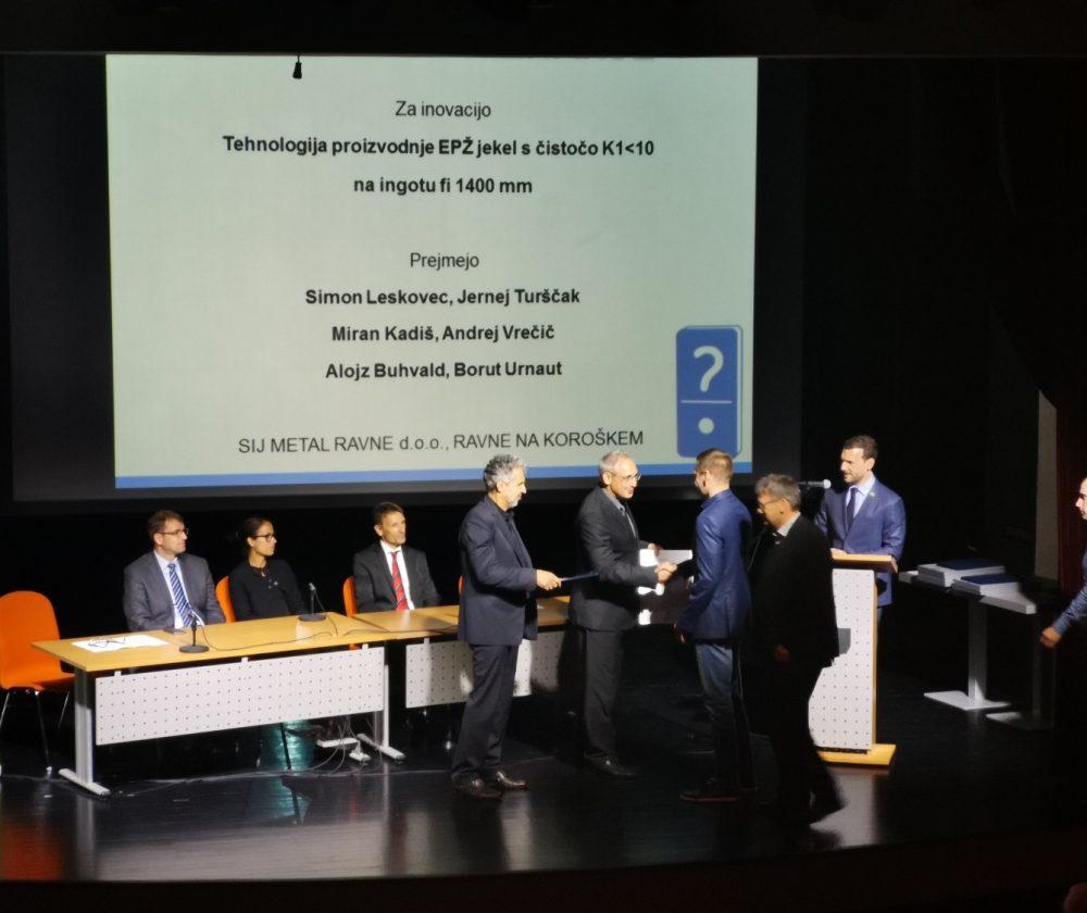 Nagrajenec: SIJ METAL RAVNE d.o.o., RAVNE NA KOROŠKEM. Naslov inovacije: Tehnologija proizvodnje EPŽ jekel s čistočo K1<10 na ingotu fi 1400 mm. Inovatorji: Simon Leskovec, Jernej Turščak, Miran Kadiš, Andrej Vrečič, Alojz Buhvald in Borut Urnaut. Ker je družba SIJ Metal Ravne prva v Evropi, ki izdeluje orodna jekla za delo v vročem v navedem dimenzijskem razredu, je z inovacijo uspela zadržati na globalnem trgu vodilno pozicijo pri izdelavi izdelkov iz velikih EPŽ ingotov. Gre za ključno konkurenčno prednost na področju izdelave blokov za velika orodja za utopno kovanje in tlačno litje, pri čemer se s tehnologijo uvršča med redke v svetovnem merilu, ki na velikih dimenzijah dosegajo navedeno čistočo jekla. Inovacijska ekipa obsega strokovnjake na področju izdelave jekla po EPŽ postopku, s področja jeklarske tehnologije, kovaške tehnologije ter RR oddelka na nivoju podjetja.