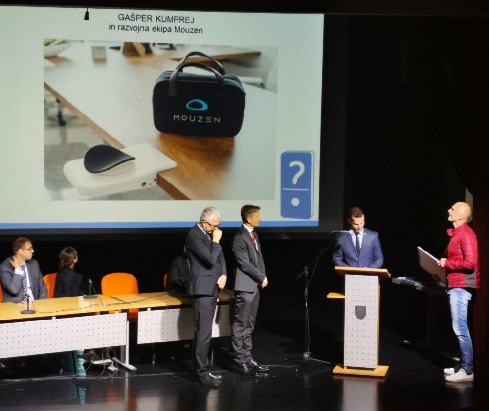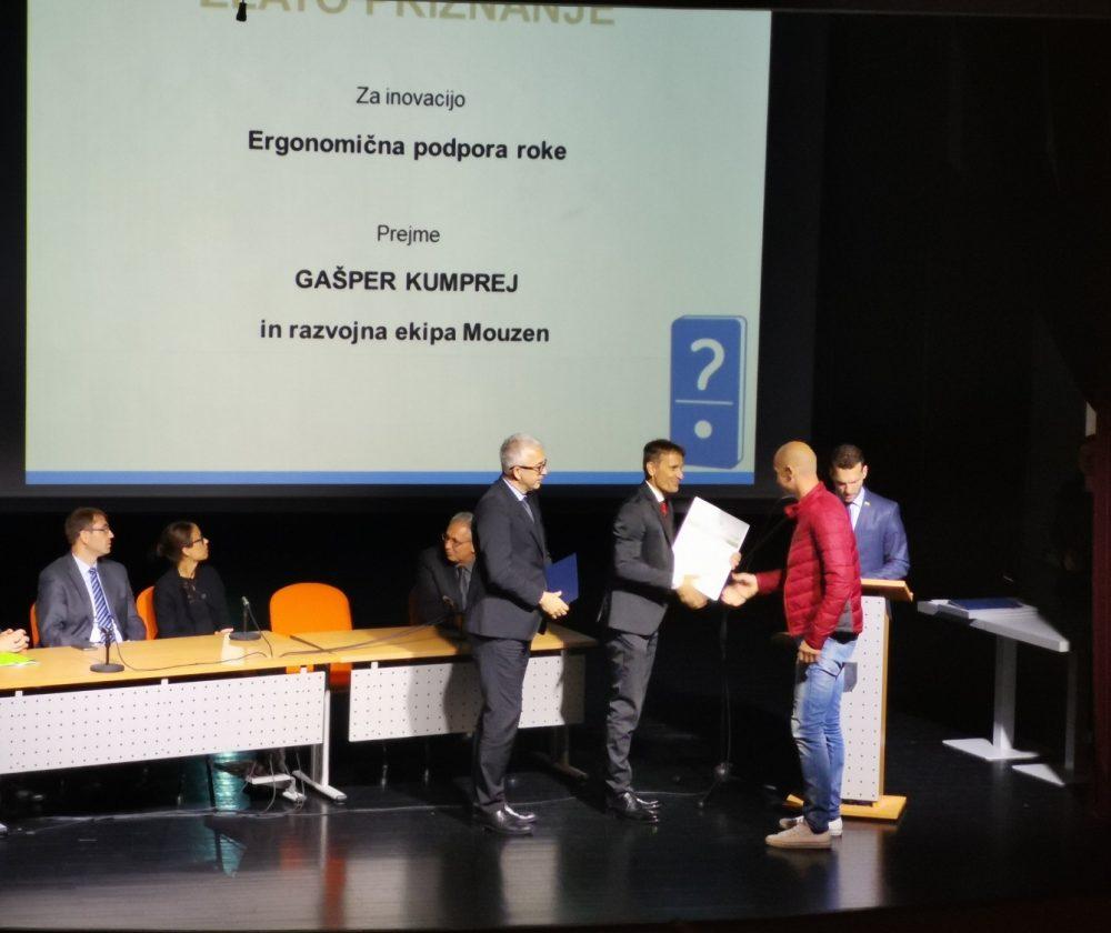 Nagrajenec- inovatorji: GAŠPER KUMPREJ in razvojna ekipa Mouzen. Naslov inovacije: Ergonomična podpora roke. Ergonomsko podporo Mouzen je idejni vodja Gašper Kumprej z razvojno ekipo snoval 3 leta, testirana je z več kot 100 uporabniki. Izdelek preprečuje bolečine, ki nastanejo zaradi neprimernih gibov zapestja pri uporabi računalniške miške. Ergonomična podpora roke je prilagojena za vse uporabnike in omogoča premike v vse smeri. Patentirani mehanizem ErgoFlow je med prvimi, ki je v tehnologijo premikov vpeljal tudi izjemen design. Projekt Mouzen je trenutno aktiven na platformi Kickstarter in ima potencial na globalnem trgu. Razvojno ekipo predstavljajo: Gašper Kumprej- Vodja projekta, zamisel za izdelek, Jure Krof- profesor, tehnik, strojna izdelava, Matej Lorenci- oblikovanje in pomoč pri plastičnih komponentah, Benjamin Koren- industrijsko oblikovanje, Roberth Kumprej- ocenitev trga, investitor, Branko Miler- investitor, Rok Medvešek- oblikovanje, Miha Kolar- Video in fotografija, Miha Ceklin - raziskava trga ( kickstarter), Petra Kosi- socialna omrežja in MPIK koroška- svetovanja v prejšnjih fazah.